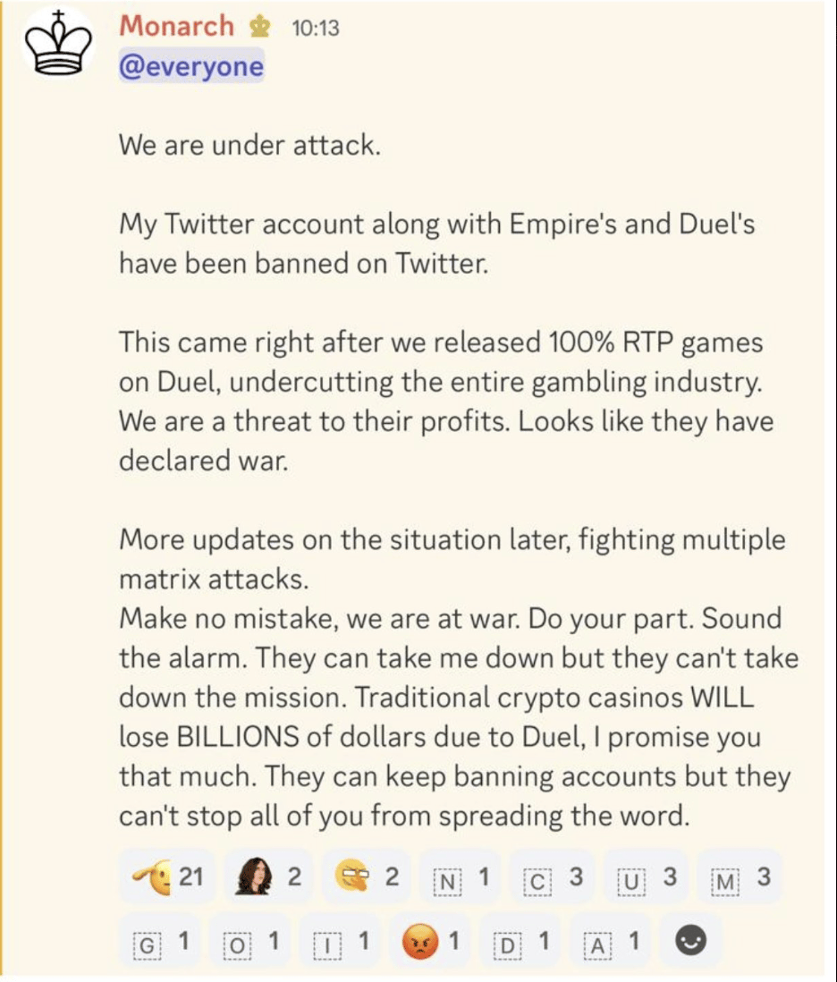 TL;DR: Monarch, Duel, and CSGOEmpire got suspended from X right after revealing 100% RTP (no house edge) games on Duel. The timing feels too perfect, sparking rumors of industry pressure to shut them down. Whether it’s coincidence or sabotage, it highlights how disruptive the no-house-edge model could be for crypto gambling.