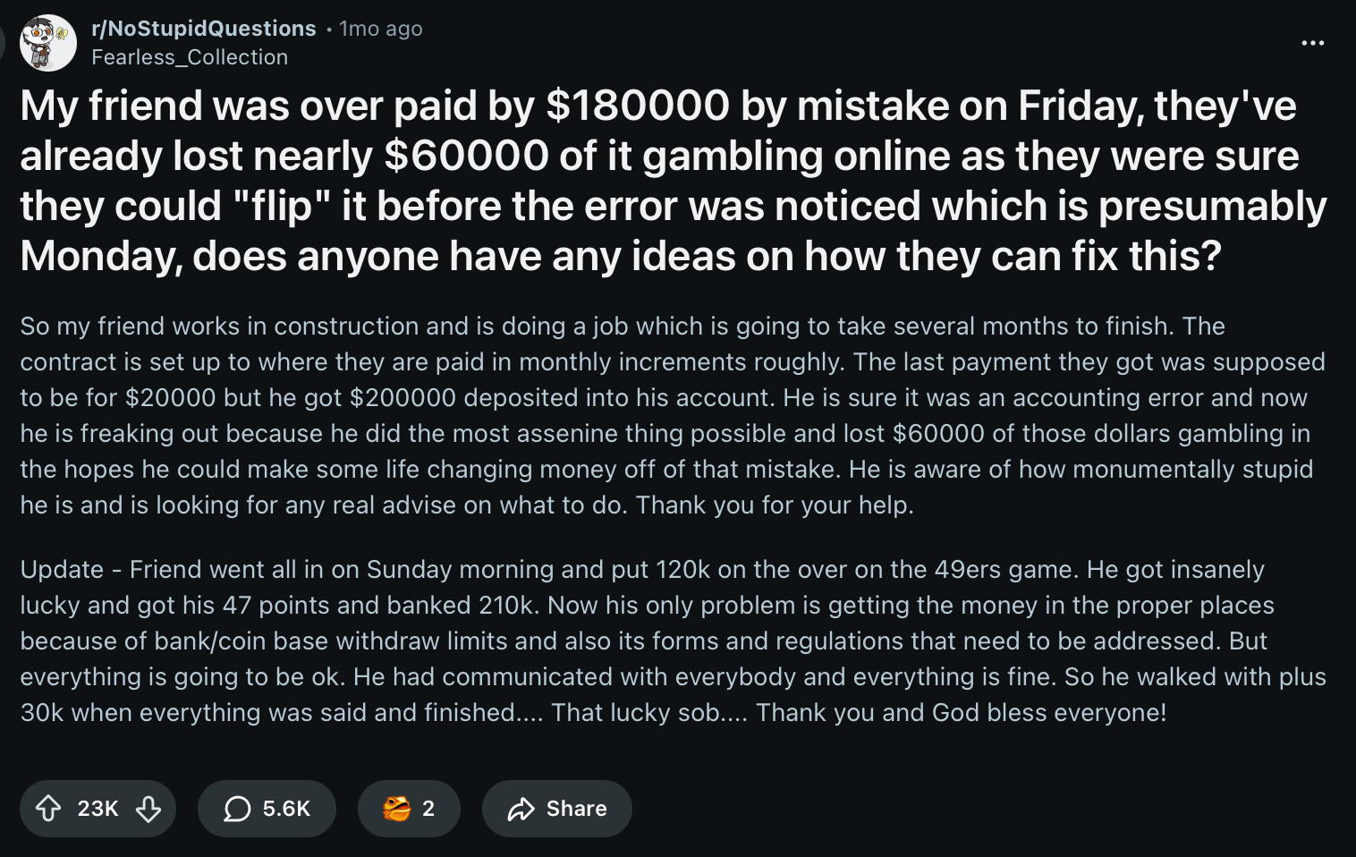 TL;DR: A construction worker checks his account expecting $20K and finds $200K instead. Instead of calling HR, he opens a gambling app, loses $60K, then wins it all back (and more) on football. A story of degeneracy, faith, and the beauty of bad decisions.